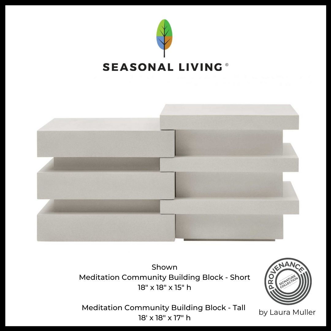 Below, see examples of all 3 materials used in our *Provenance Signature Collection by Laura Muller* – outdoor wicker for our LEEWARD chair, FRP for our MEDITATION COMMUNITY block occasional tables and handcrafted ceramics for the SERENITY textured planters [sold as a set, one large, one small ] shown in the lower left.