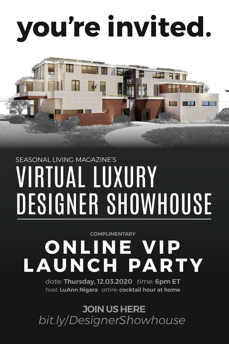 You will be able to get a sneak peek into some of the rooms in Seasonal Living Magazine’s Luxury Virtual Designer Showhouse when it debuts during our online VIP launch festivities event that will take place on Thursday, Dec. 3rd at 6 pm ET, on YouTube! Get your complimentary registration to attend, here.