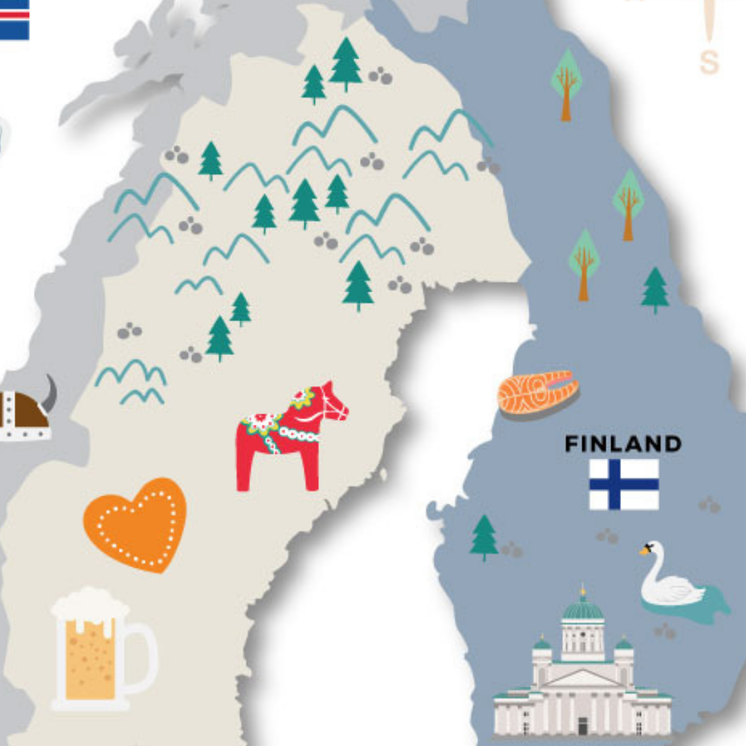 Below is a *sneak peek* of our custom illustrated map found in our new issue. Did you know that Greenland, the Faroe Islands, the Aland Islands, and Svalbard are all also considered part of the *Nordic* countries now?