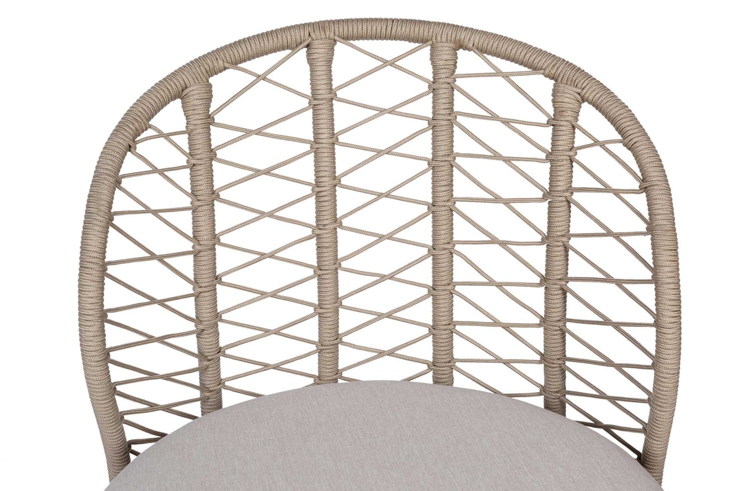 Warm Taupe powder-coated steel frame, Warm Taupe polypropylene rope weave, nylon glides; regular foam seat cushion with raincoat, Equatorial Drift Olefin zippered cover