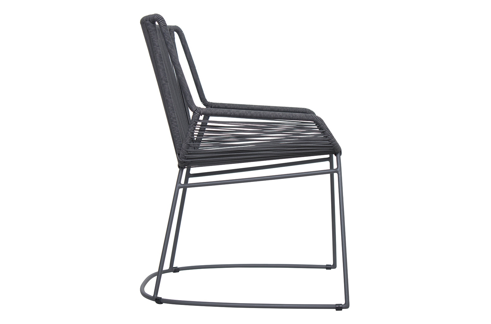 Powder-coated galvanized steel frame, polypropylene rope weave, black nylon glides